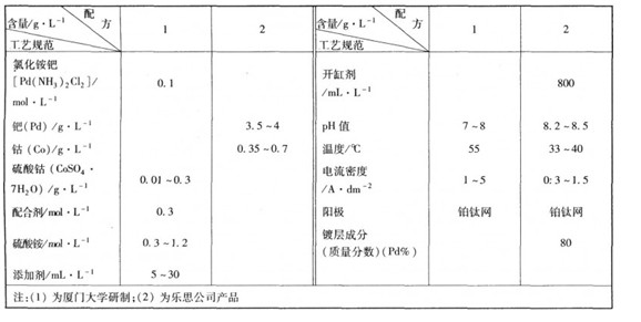 深圳表面處理網(wǎng):金屬鉆和鎳以及它們的鹽在電極過程中的電化學(xué)行為極為相似,下面介紹兩種電鍍鈀鈷合金工藝,見表4-7-9。鈀鈷合金鍍液的配制方法及鍍層的性質(zhì)與鈀鎳合金類似。